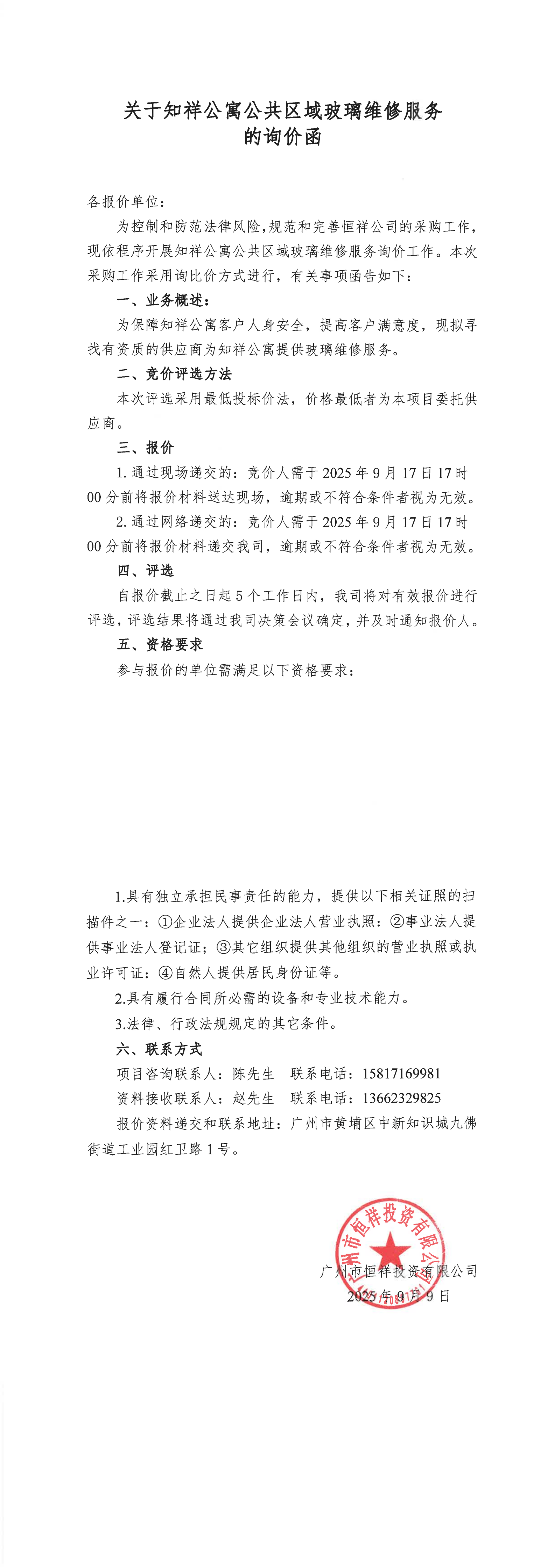 关于知祥公寓公共区域玻璃维修服务的询价函