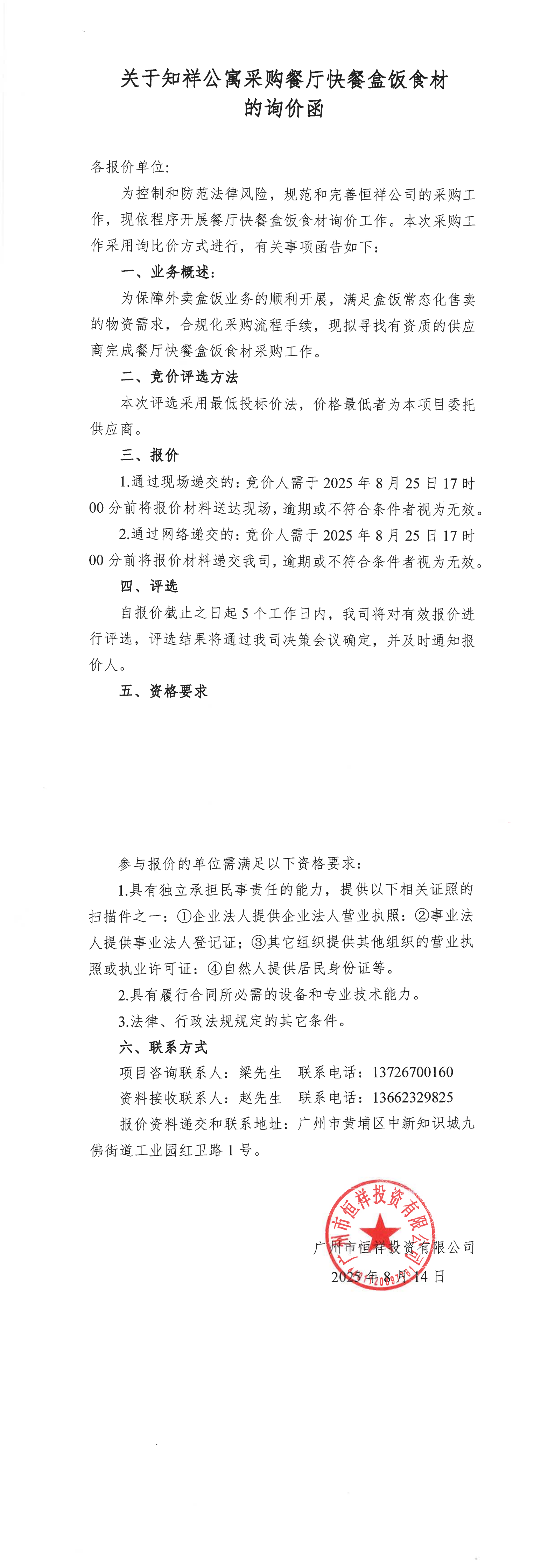 关于知祥公寓采购餐厅快餐盒饭食材的询价函