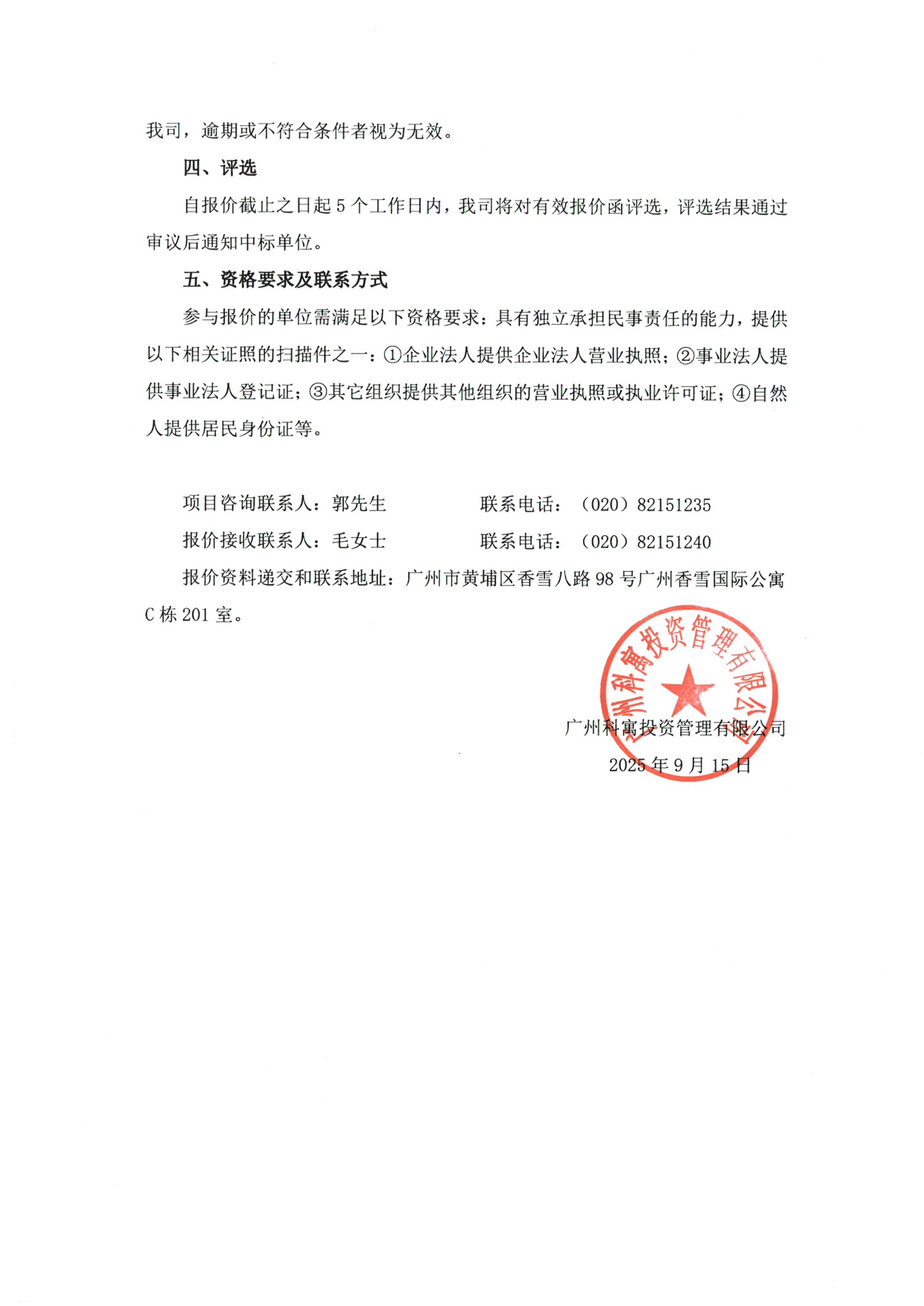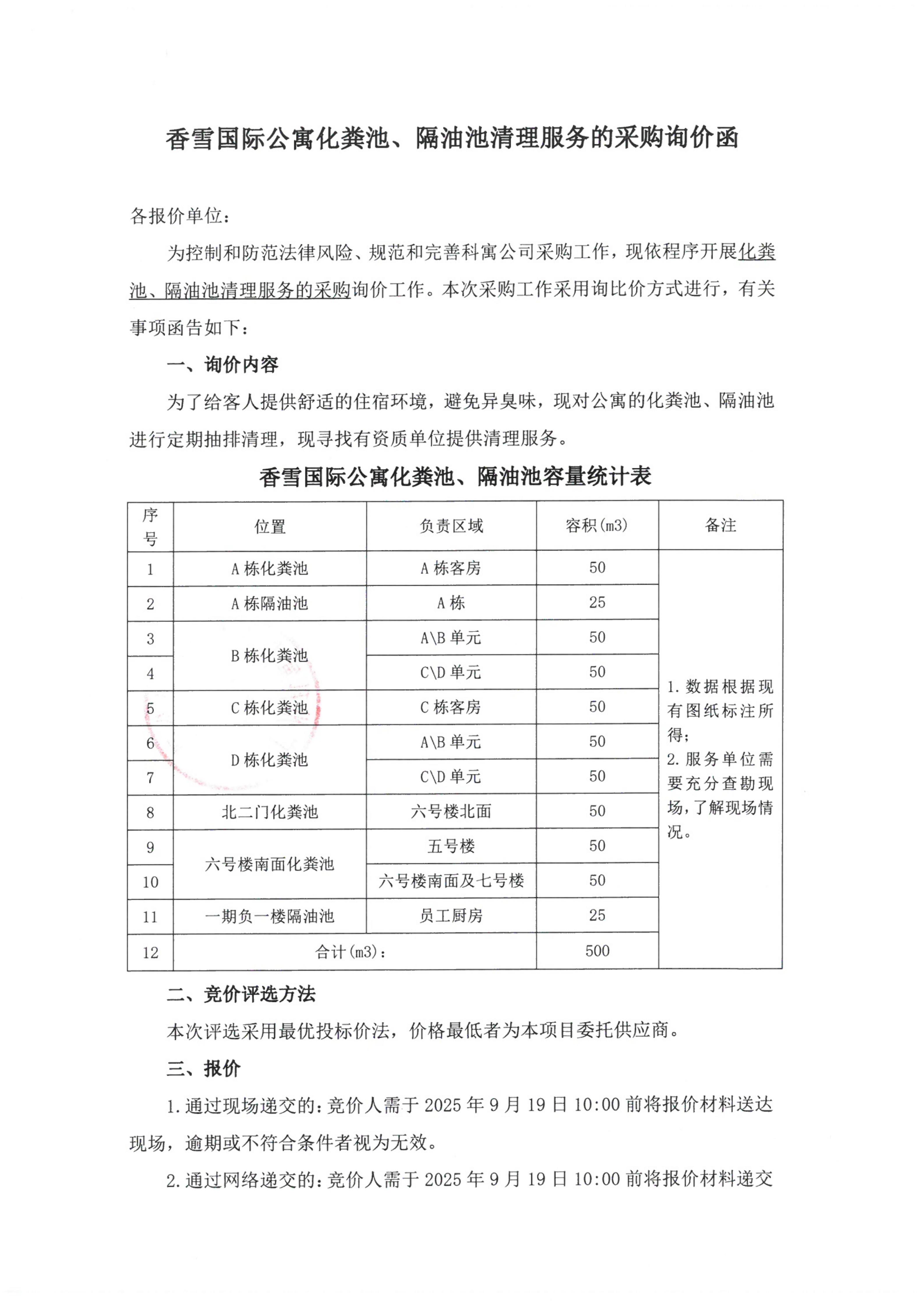 香雪国际公寓化粪池、隔油池清理服务的采购询价函