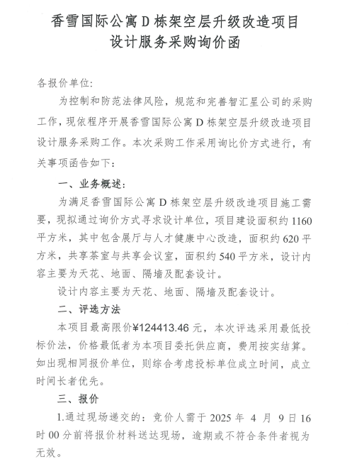 香雪国际公寓D栋架空层升级改造项目 设计服务采购询价函