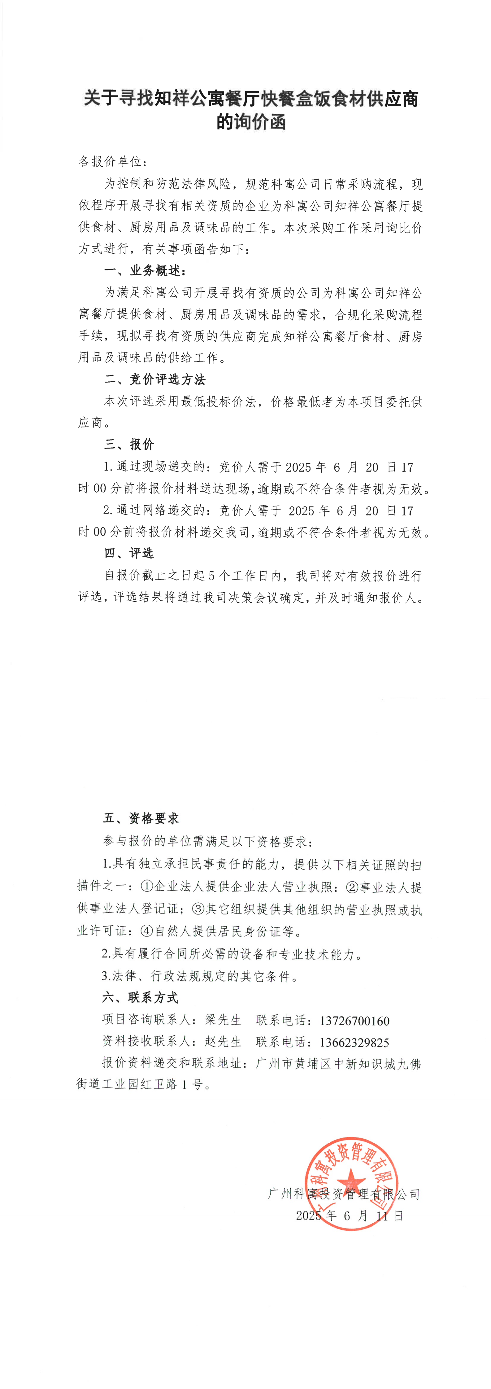 关于寻找知祥公寓餐厅快餐盒饭食材供应商的询价函