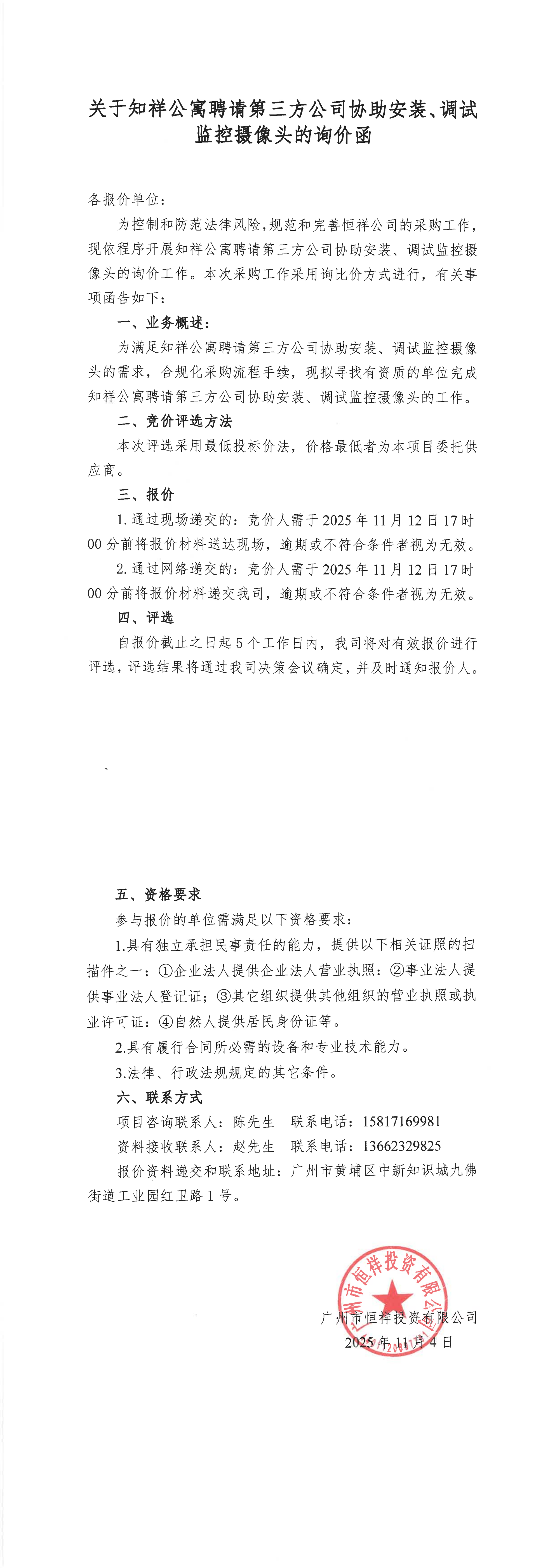 关于知祥公寓聘请第三方公司协助安装、调试监控摄像头的询价函