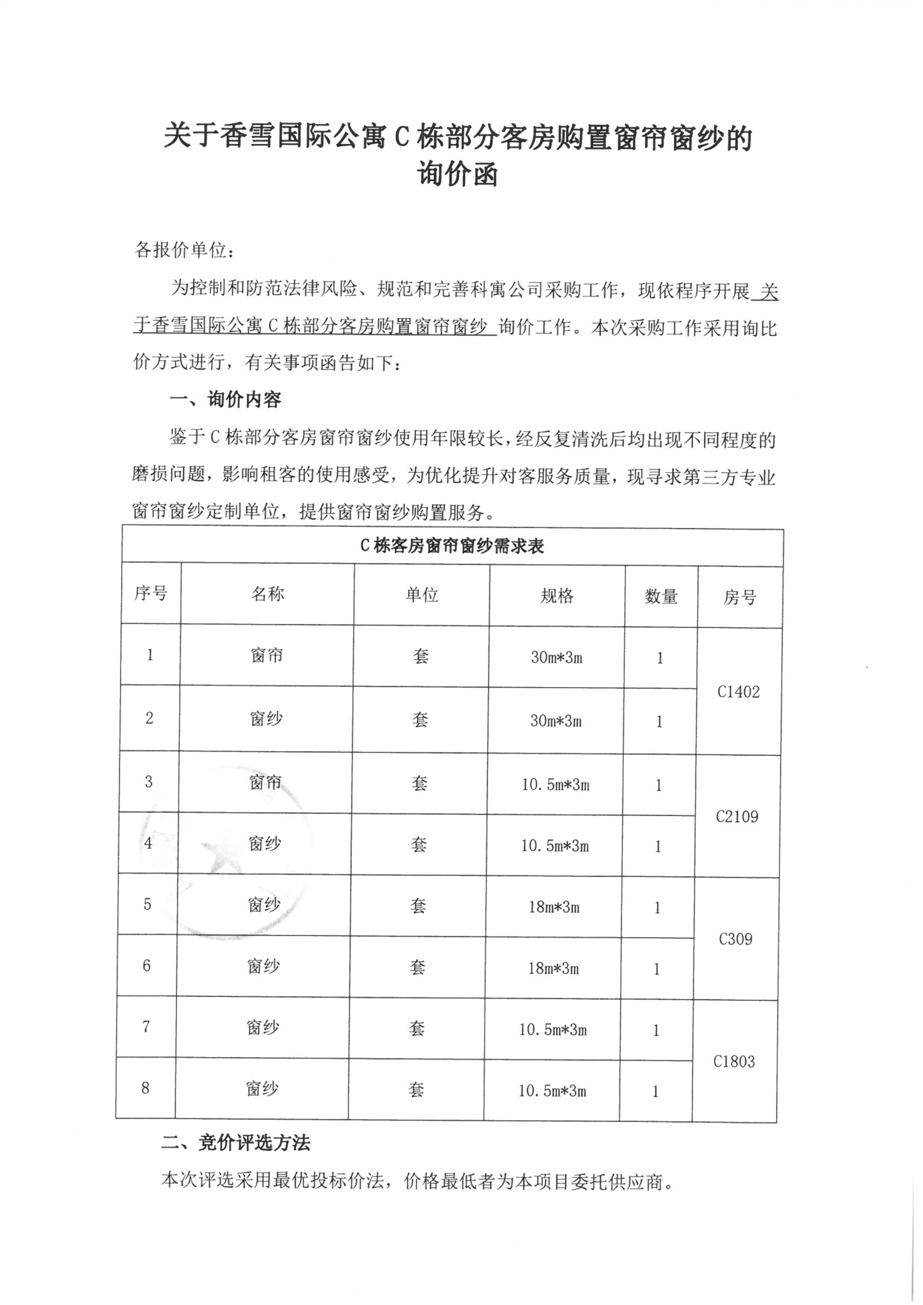 关于香雪国际公寓C栋部分客房购置窗帘窗纱的询价函