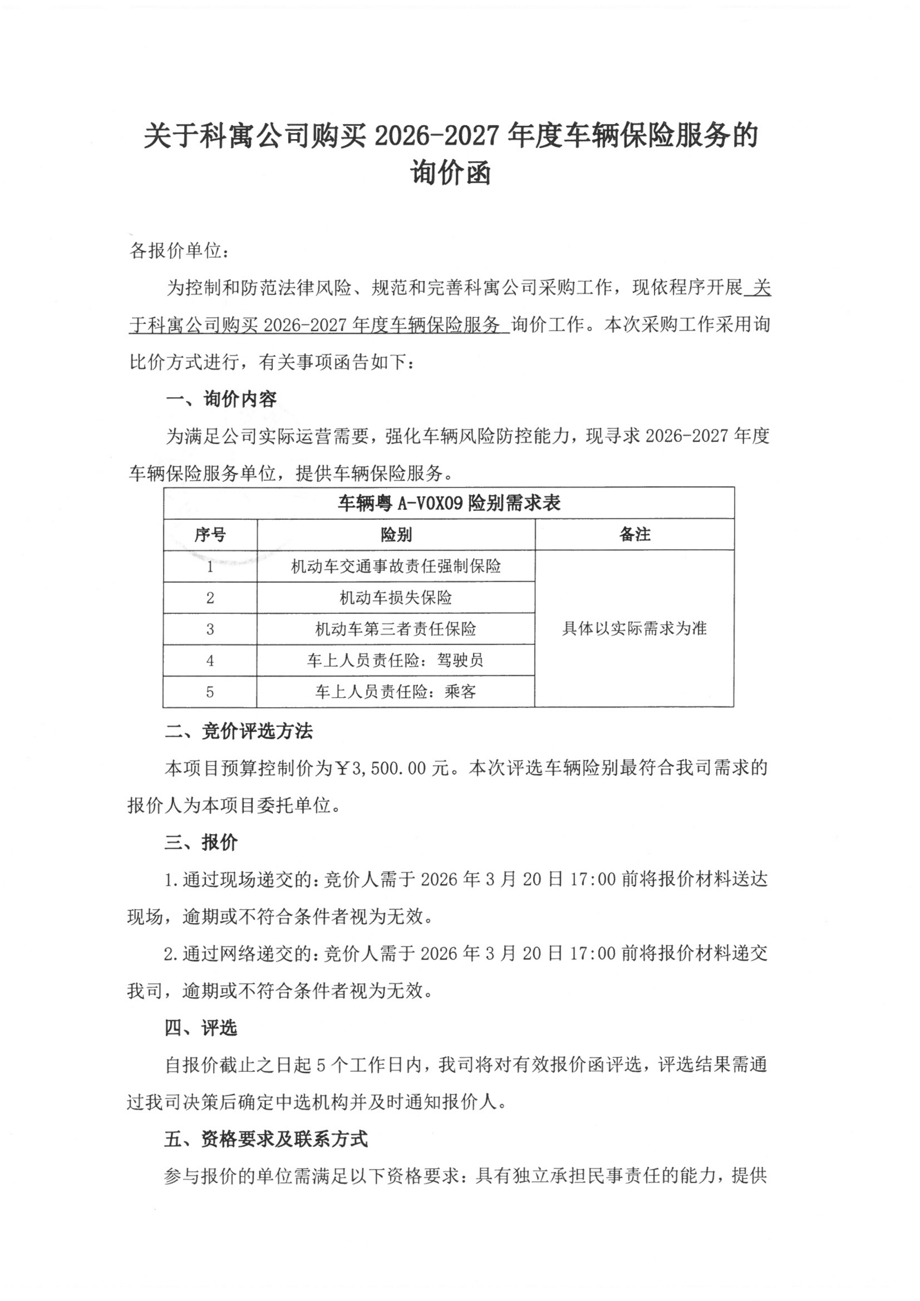 关于科寓公司购买2026-2027年度车辆保险服务的询价函