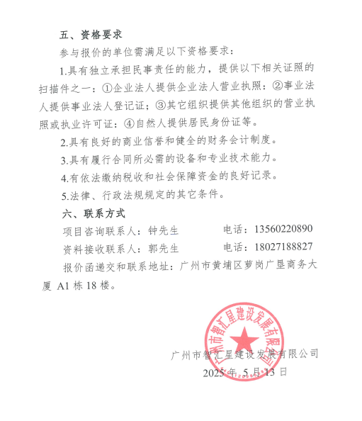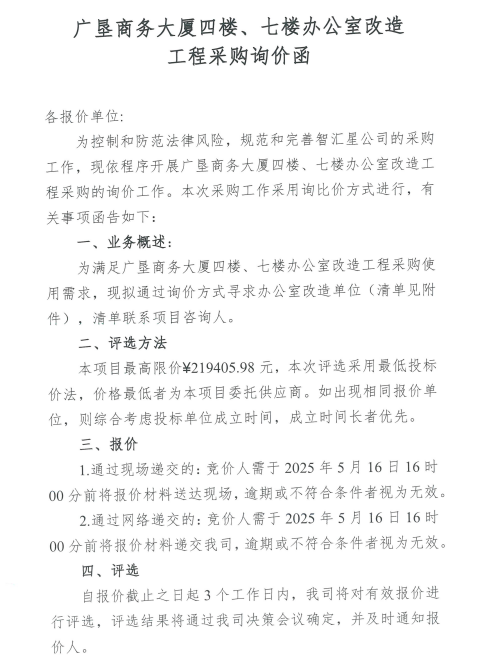 广垦商务大厦四楼、七楼办公室改造 工程采购询价函