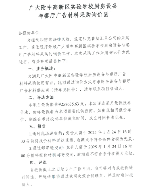广大附中高新区实验学校厨房设备 与餐厅广告材料采购询价函