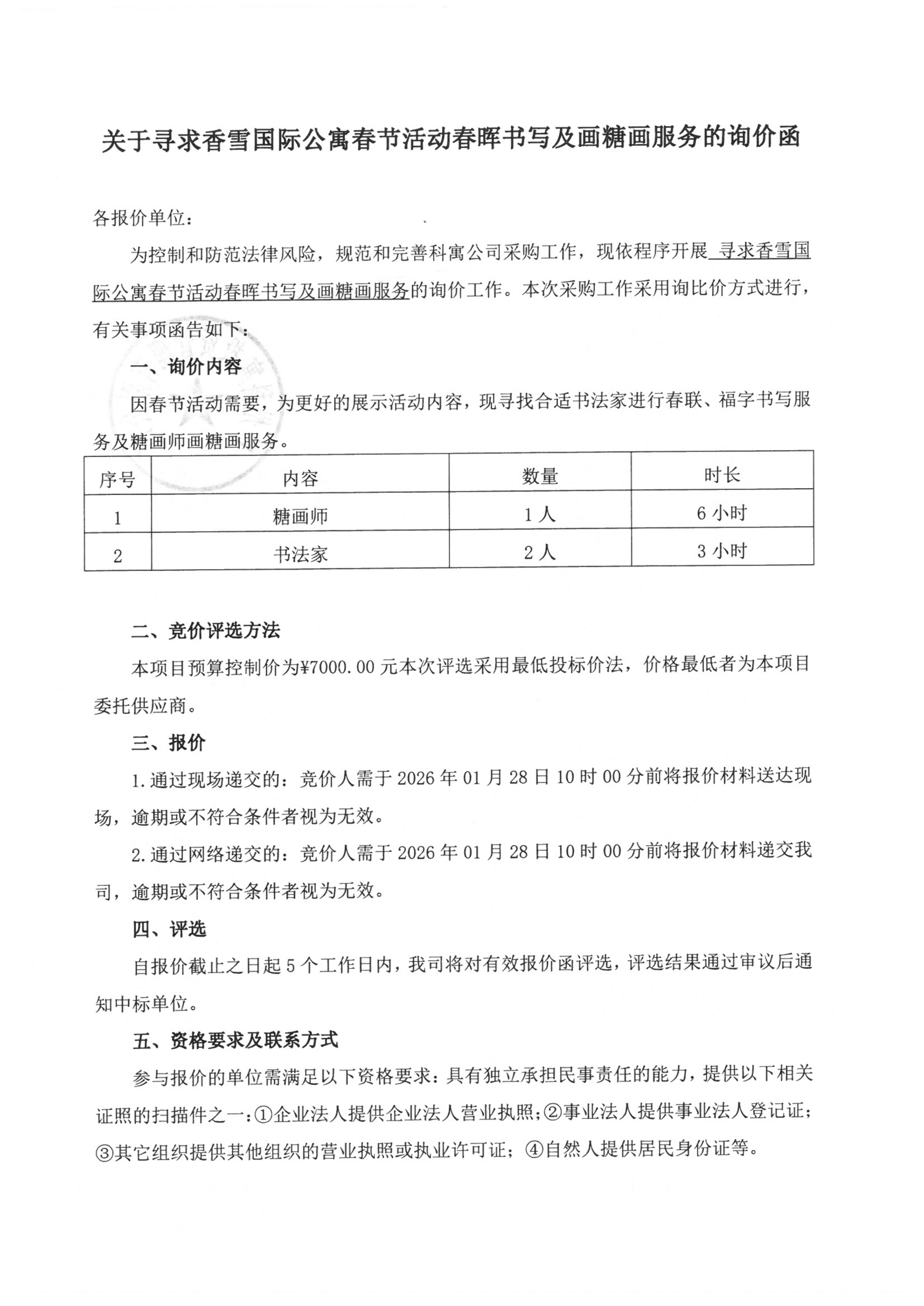 关于签订香雪国际公寓春节活动春晖书写及画糖画服务合作协议合同的请示