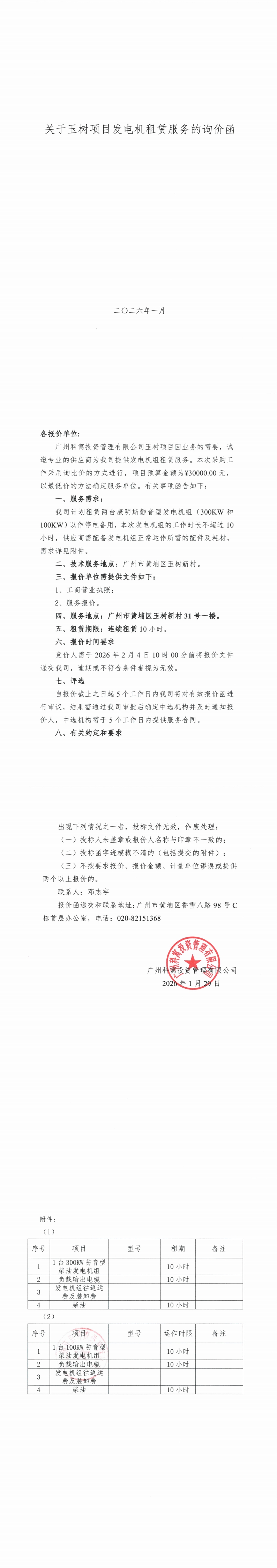 关于玉树项目发电机租赁服务的询价函