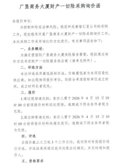 广垦商务大厦财产一切险采购询价函